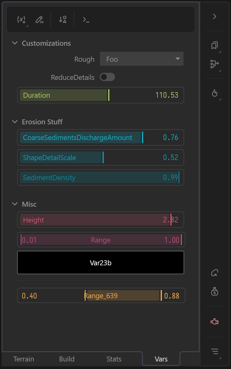 Gaea supports Float (decimal), Int (whole number), Choice (dropdowns), Color, Range (float2), and String. There is an additional Undefined variable type for advanced use and error handling.