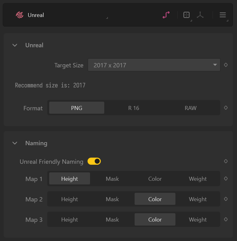 The Unreal node is made to prepare your data to be imported into Unreal Engine very easily using the Gaea2Unreal bridge plugin. The Unreal node will resample the data to a Unreal friendly resolution (for example, a 2048 x 2048 build will become 2017 x 2017 to accommodate UE's considerations).