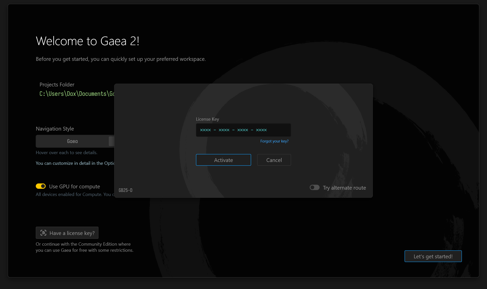 If you have a License Key, you can also enter it here to activate all the features of your Gaea Edition. You can find the License Key in the email you received after purchasing Gaea 2.