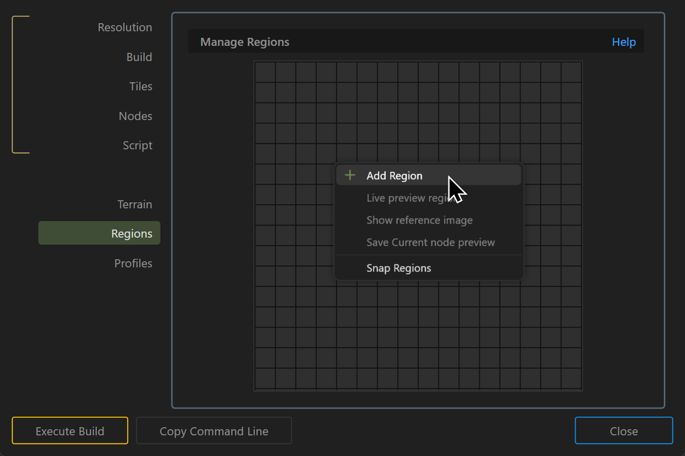- Region: Select the build scope, options can be Whole terrain or select a region from the dropdown.
