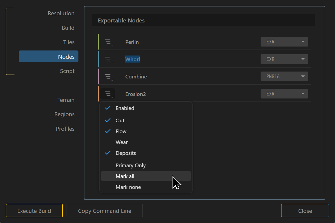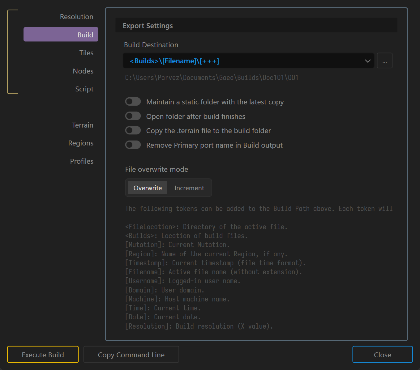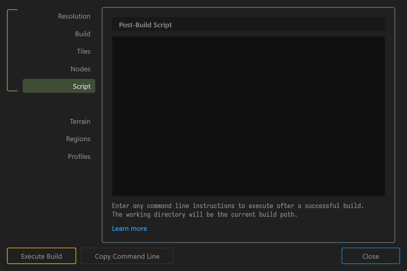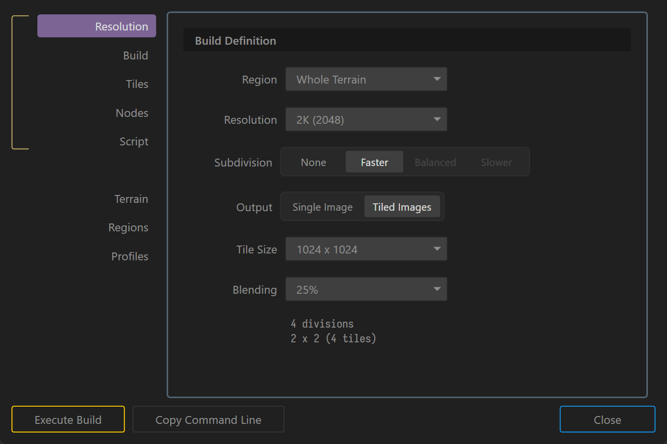 Build Profiles let you save all Build Settings in a named preset. If you find yourself creating multiple versions of your terrain, or creating different output types, you can switch between the different build settings swiftly with Profiles.