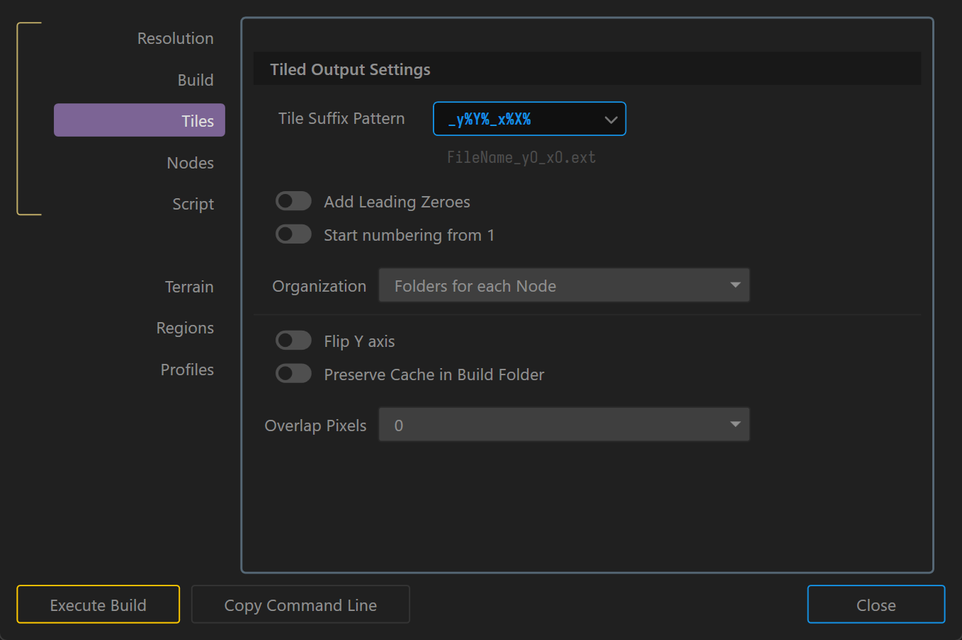 - Tile Suffix Pattern: Choose a suffix format for naming tiles (e.g.,