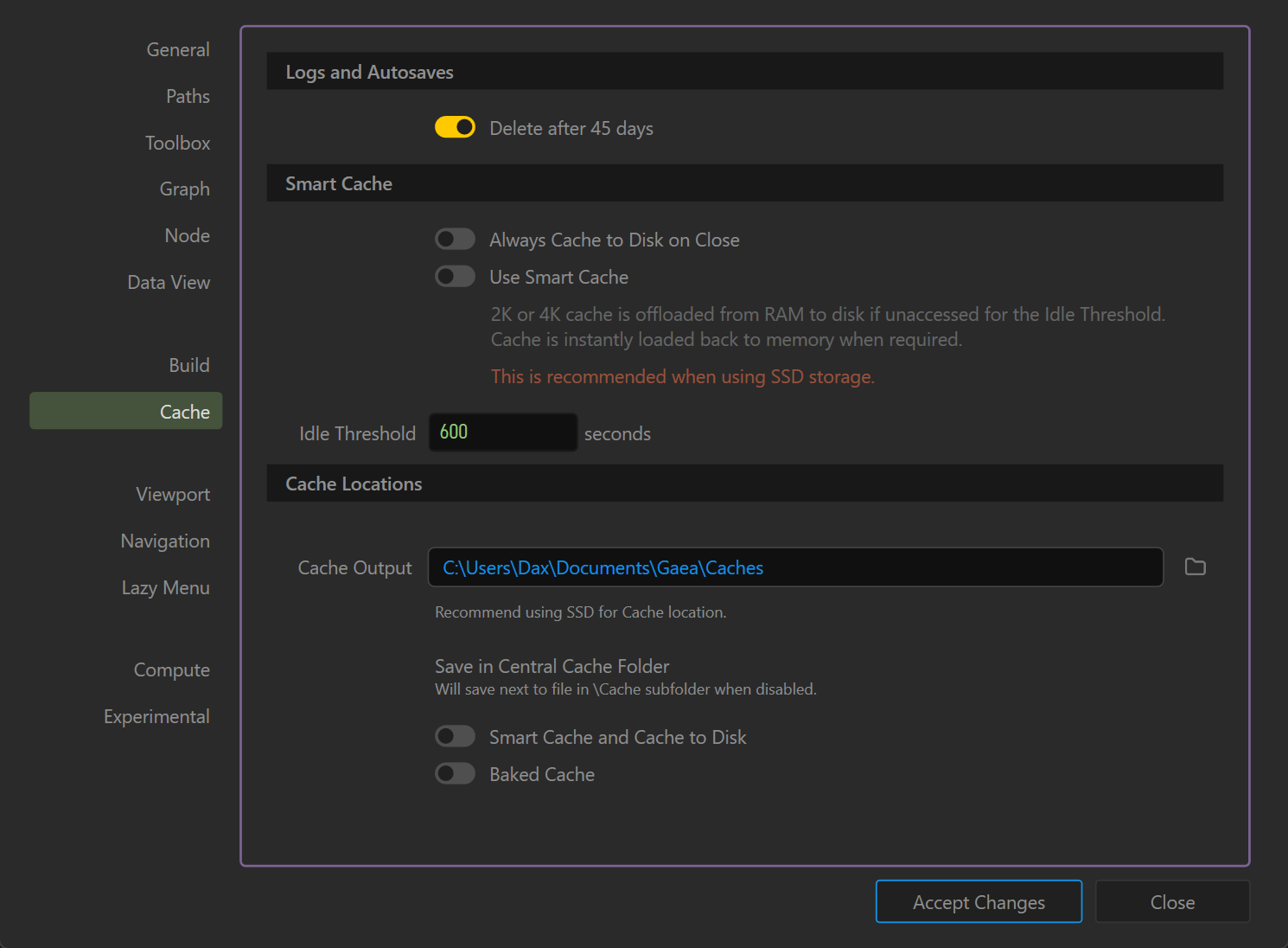 The Cache tab manages how Gaea stores temporary data and autosaves, allowing you to balance memory usage, disk performance, and long-term cleanup.