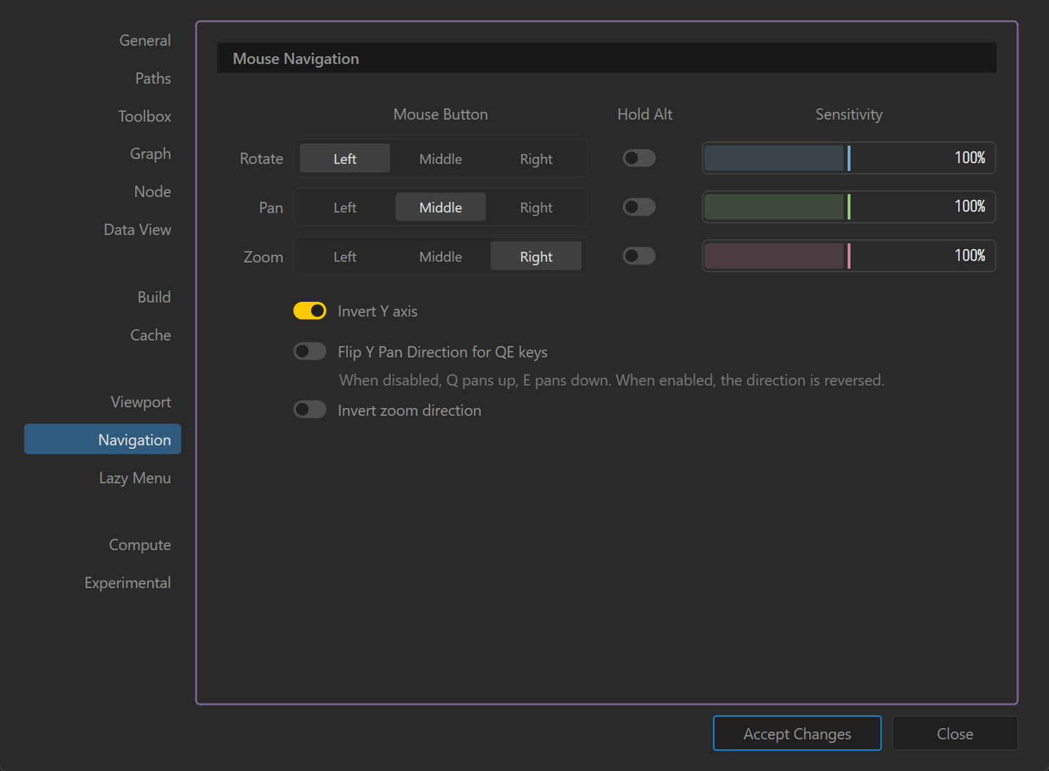 - Pan: Choose Left, Middle, or Right mouse button for panning the view.