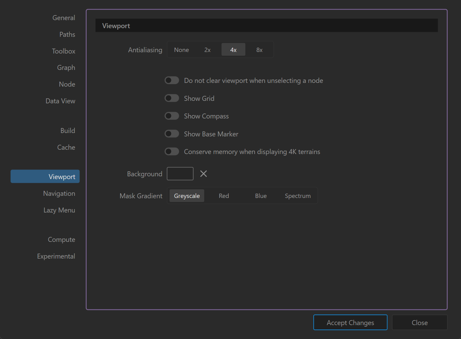 The Viewport tab allows you to configure the visual display settings for Gaea’s 3D viewport. These options affect how terrains and masks are rendered during editing and previewing.