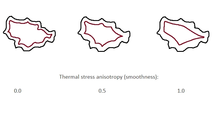 Thermal Stress Anisotropy governs how erosion and the resulting rock deposits are shaped. It smooths the terrain while eroding. Low values largely keep the original terrain intact. High values create stronger talus while eroding the original terrain. For example, sharp peaks get eroded heavily with high stress values.