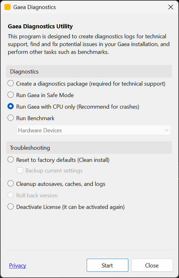 To enable CPU only mode, start Gaea Diagnostics from the Start Menu. Select "Run Gaea with CPU only" and click "Start".