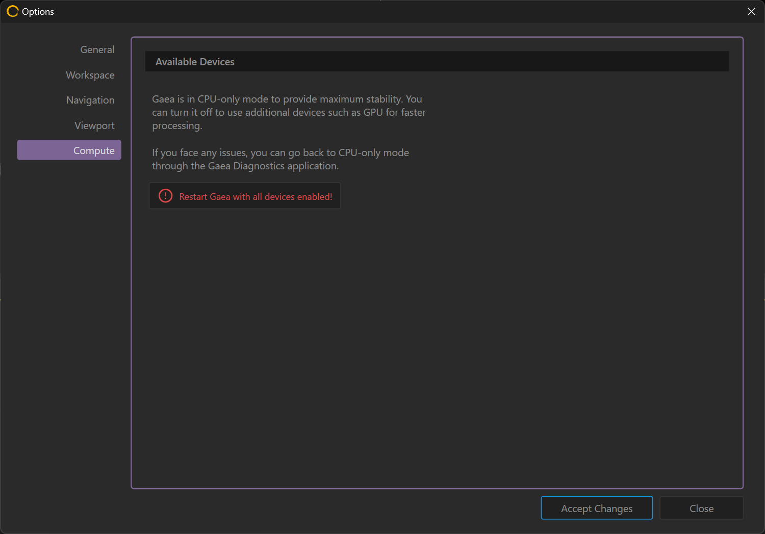 This will start Gaea in CPU only mode. It will now remain in CPU only mode, including when running the Gaea Build CLI.
